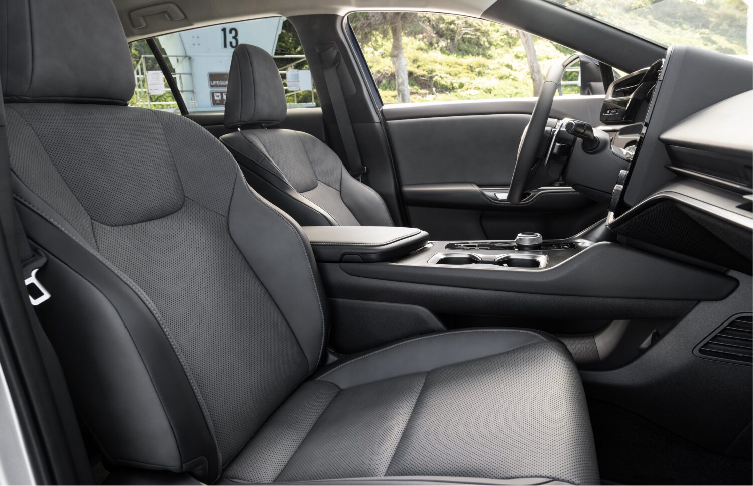 The concept of oto-kukan, Japanese for “sound space”, lends to the RZ’s peaceful interior as it aims to eliminate unwanted exterior sounds from entering the passenger cabin. Features helping the vehicle achieve a serene environment include: a slimmer A-pillar cross-section (to better manage passing airflow); a continuous hood seal rubber that reduces wind entry and turbulence; sound-dampening carpets, glass, and foam; and Active Sound Control (ASC). ASC directs EV system sound frequencies into the cabin to cancel out unwanted penetrating noise, giving the driver clearer vehicle feedback.