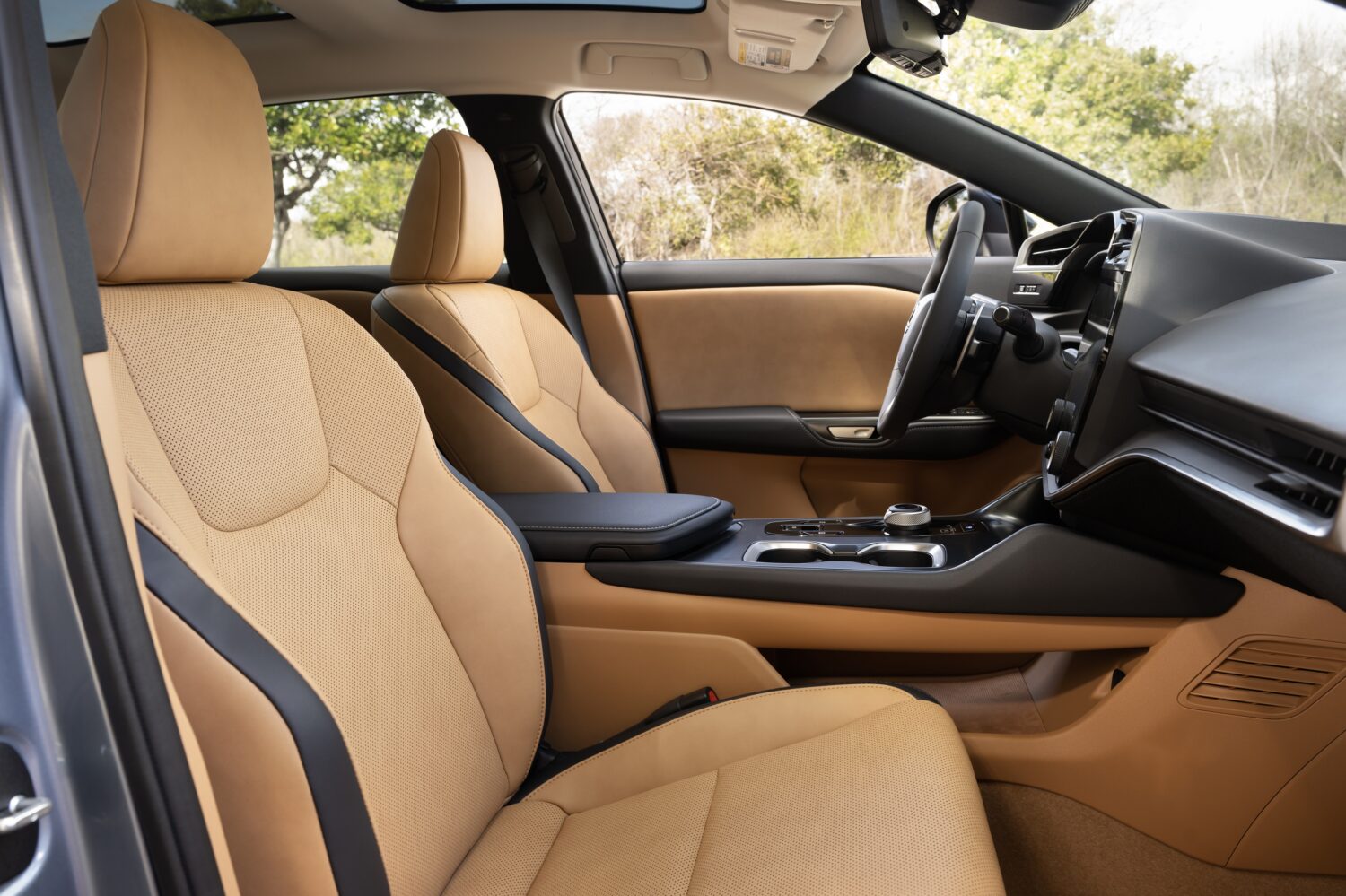 The RZ’s cabin is a minimalist, yet airy and maximally appointed luxury environment. RZ’s interior layout benefits from a compact powertrain with a low platform and thoughtful wheel placement. RZ’s low hood allows for better front passenger forward visibility and the available panorama glass roof further lends a sense of wide openness and front-to-rear expansiveness. The goal of eliminating a roller shade function and adopting a smart-function low-e coating is to help the panorama glass roof suppress radiant heat. A dimming function, which instantly reduces the amount of light entering the cabin area, is available with the Dynamic Sky™ panorama glass roof option.