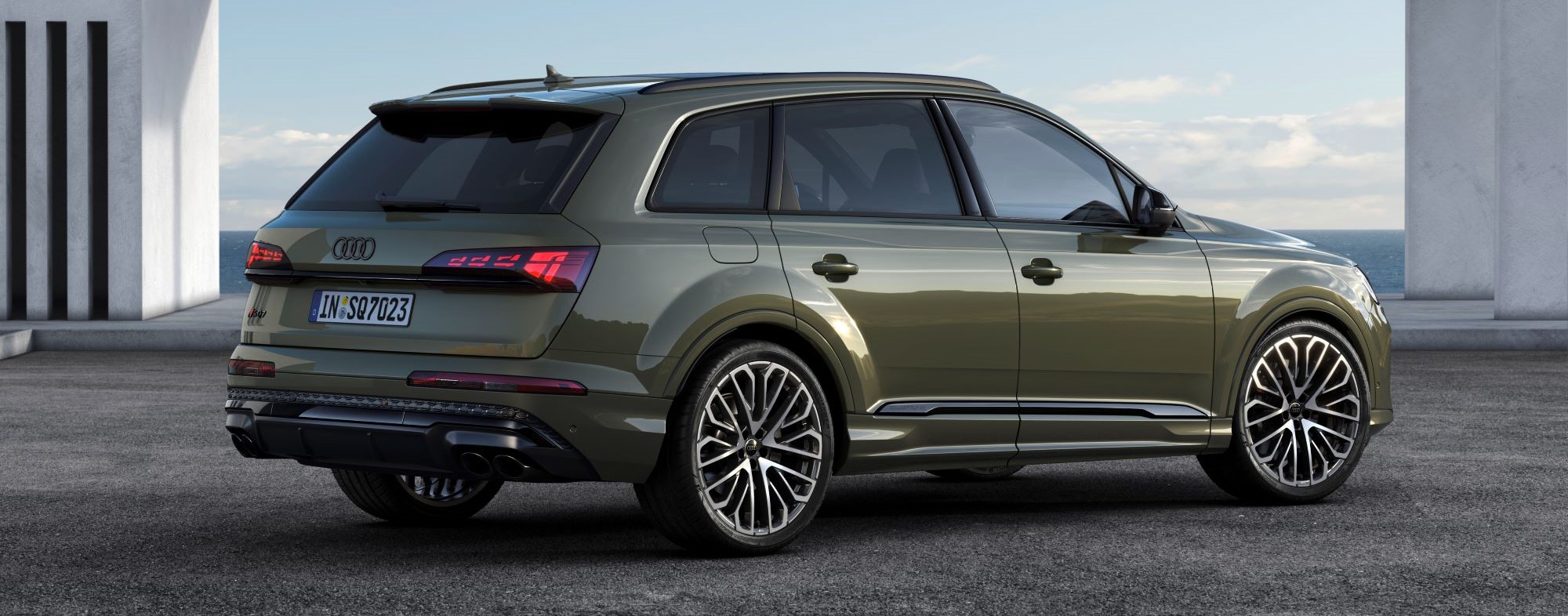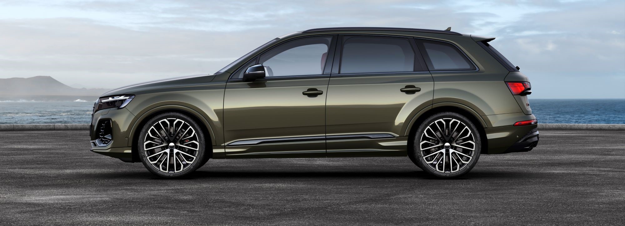 Audi has systematically reduced the total number of decorative elements on the front of the Q7 and SQ7, helping deliver a cleaner look overall. Further distinguishing 2025 models, elements of the front bumper, door attachment trim, and diffuser can be configured in various finishes. The available Black optic package presents black accents around the Singleframe grille, the trim on the side windows, and on the front and rear fascias. Additionally, the package provides Anthracite Gray Audi rings and dark chrome exhaust tips for both the Q7 and SQ7 models. This package also includes 20” wheels on the Q7 45, and 21” wheels on the Q7 55 (an option on the Q7 45). For the SQ7, the package includes specific 21” 6-Y-spoke design wheels with black finish or an available 22” multispoke S design wheel.