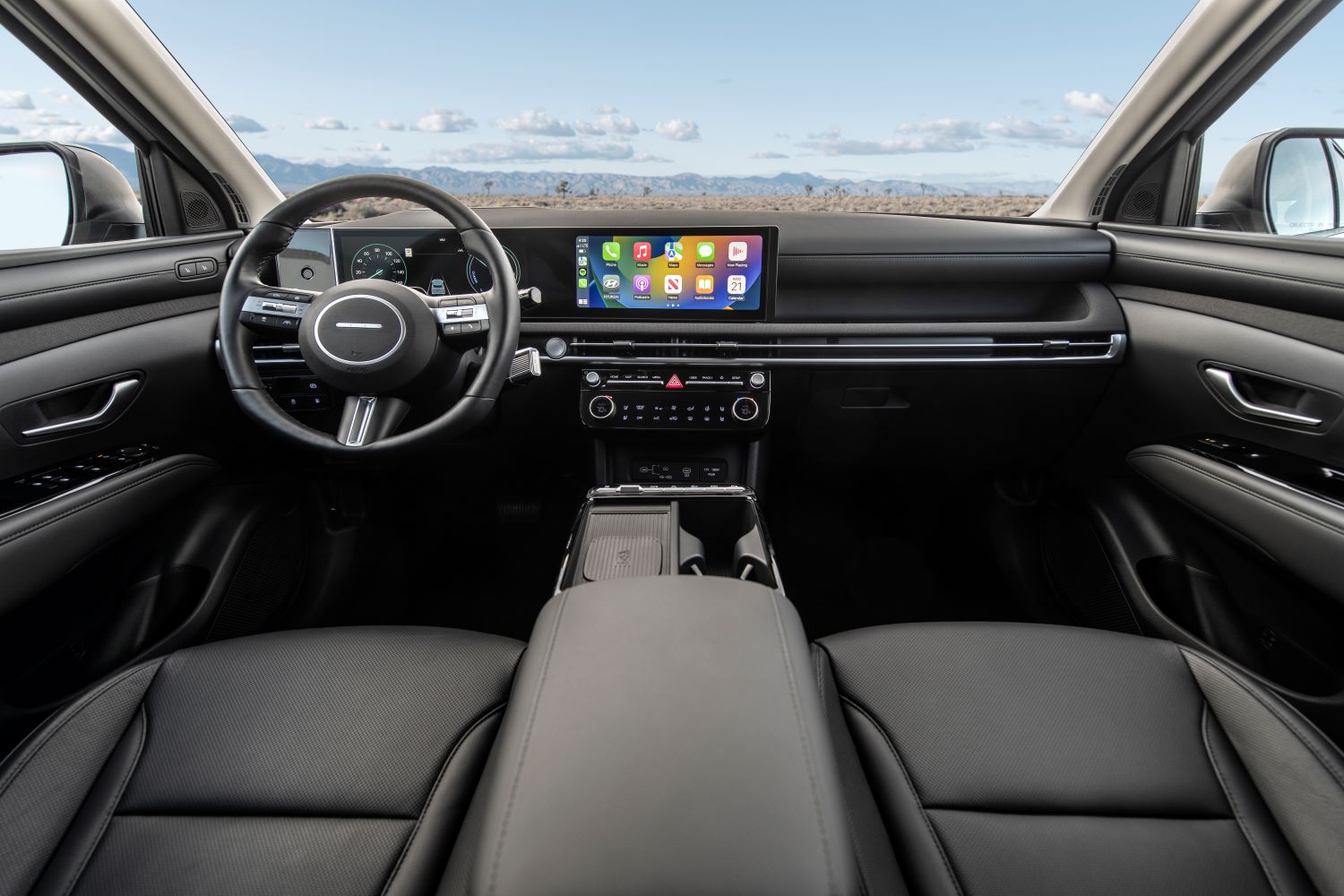 The 2025 Tucson’s interior may feature the biggest upgrades of all, thanks to a more open-feeling design and a higher-tech, yet easier-to-use infotainment interface. This cabin glow-up incorporates a redesigned panoramic curved display that integrates an available 12.3-inch digital instrument cluster and an enlarged 12.3-inch infotainment display. A redesigned center stack includes the addition of supplementary knobs and switchgear for frequent-use driver controls including audio volume and tuning, along with select HVAC controls for greatly improved ergonomics. The center console, steering wheel and door panel accents have also been redesigned for both fresh appeal and enhanced usability. A new dashboard tray located above the glovebox adds even more storage space for front-seat passengers.