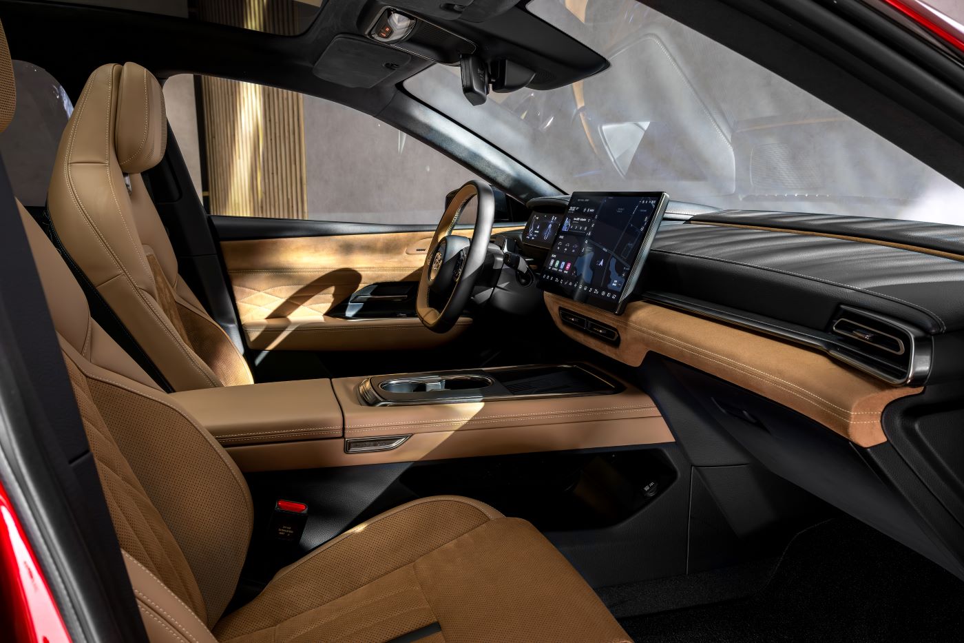 The mono-form front seats, with their integrated headrests, deliver both modern elegance and exceptional comfort. Mazda offers a choice of high-quality upholstery: Beige or Black artificial leather in the Takumi trim, and luxurious Tan Nappa and Suede cloth woven fabric in the Takumi Plus trim. Subtle satin chrome accents and meticulous stitching complete the refined, sophisticated look.