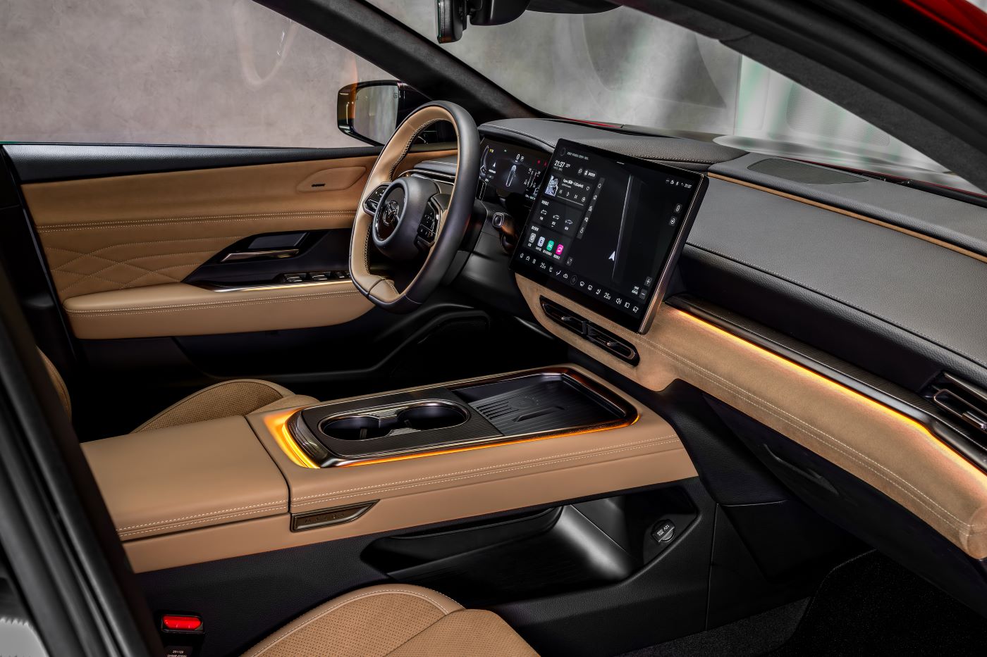 A floating horizontal dashboard stretches across the cabin, creating a sense of openness and serenity, while the prominent centre console enhances driver focus and security. The interior design prioritises minimalism with depth, replacing excess buttons and screens with intuitive, thoughtful placement of controls.