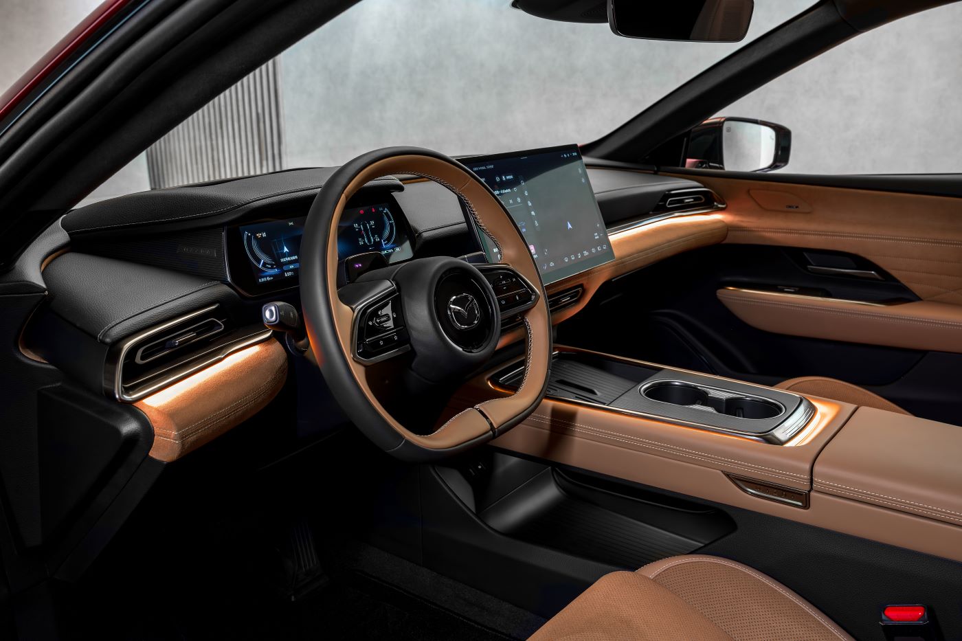 Inside, the Mazda6e’s cabin is flooded with natural light thanks to a panoramic roof that contributes to an airy ambiance and sense of space. Designed to deliver sophisticated simplicity, the spacious interior is inspired by the Japanese concept of ‘Ma’ which emphasises the beauty of space and the floating centre console and instrument panel enhance this sense of lightness. Premium materials feature throughout both the available trim levels: Takumi and Takumi Plus. Takumi models will feature black or stone Maztex^ artificial leather, while Takumi Plus offers premium tan Nappa leather with Artificial Suede Cloth woven fabric seat trim.