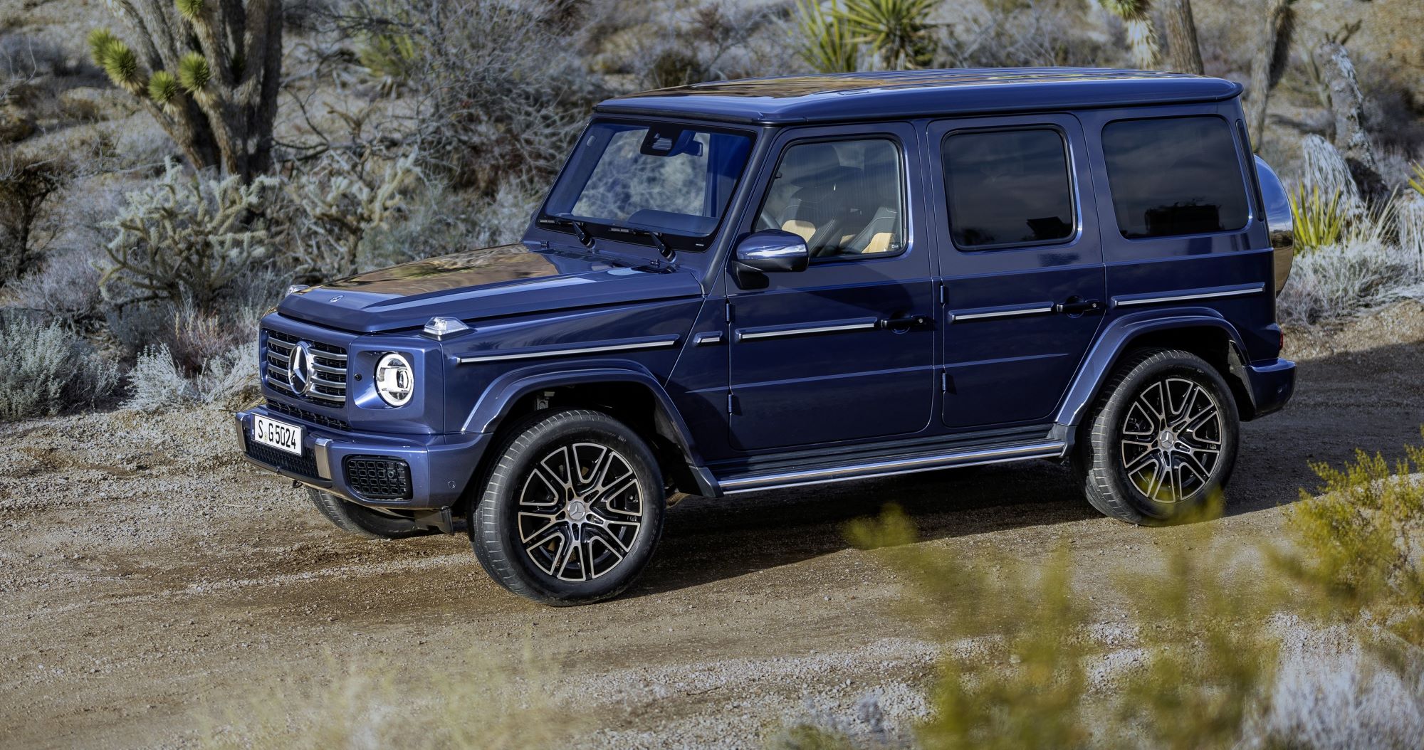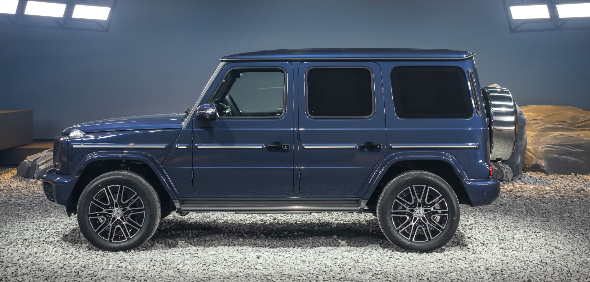 The 2025 G 550 also incorporates elements that were developed for the first all-electric version of the off- road legend. Specifically, new A-pillar trim, a spoiler lip on the roof edge and new insulation materials contribute to improved aerodynamics and noise levels. Twilight Blue Metallic paint is also available for the first time. 19-inch alloy wheels are fitted standard, while other new wheel designs in 18- to 20-inch sizes are optionally available to further sharpen the look.