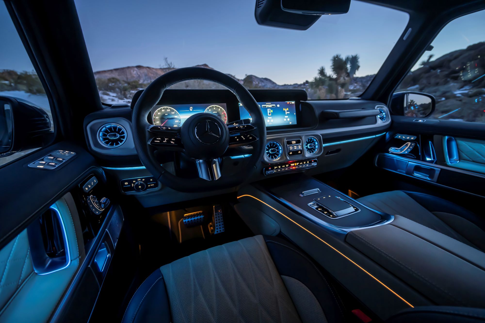 Numerous exterior design elements are also reflected in the interior. For example, the climate control vents echo the shape of the round headlights and are now also available with illumination. The grab handle in front of the front passenger seat is still present. Meanwhile, the switches for the three differential locks remain central elements of the redesigned off-road control center, which also offers the option of quick access to the OFFROAD COCKPIT. The latest-generation multifunction steering wheel in Nappa leather with capacitive touch controls is equipped standard. 64-color ambient lighting and extensive leather upholstery complete the ambience.