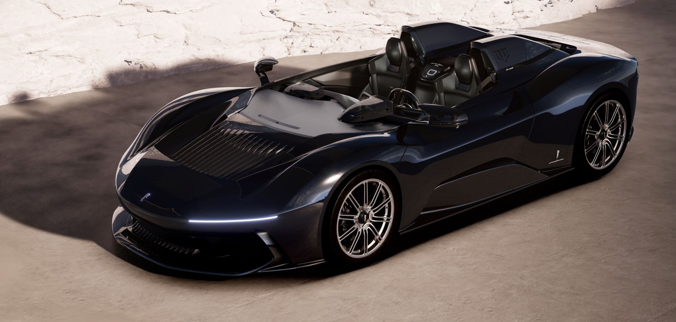 Highlighting its aerodynamic capabilities, the Battista Dark Knight includes never-before-offered tailgate shark fins and louvre openings on the carbon fibre wings, enhancing both aerodynamic stability at high speeds and brake cooling.