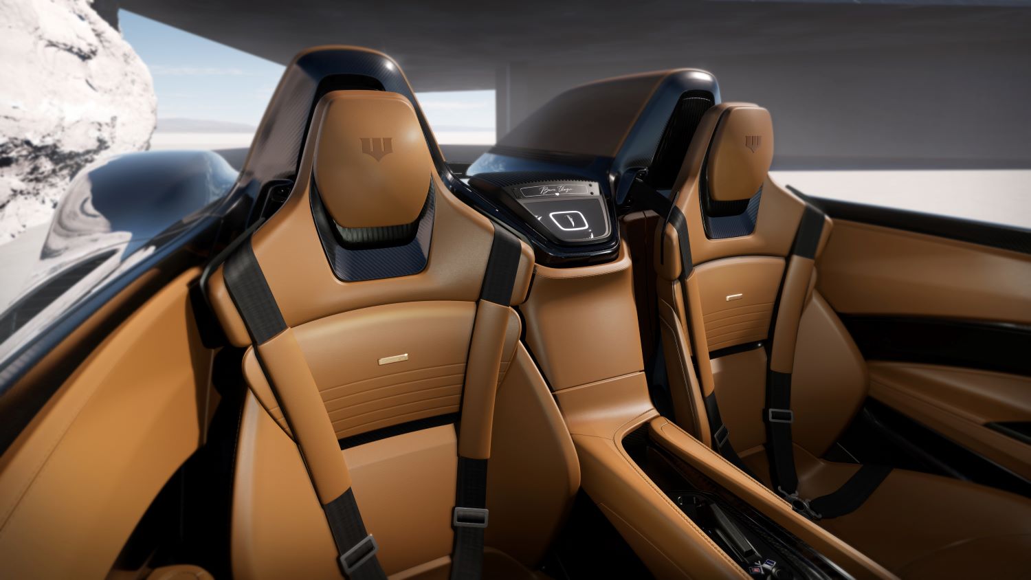 The interiors of the Battista Gotham offer a sense of peaceful luxury, with seats enveloped with fine Tan leather with unique quilting and Tan stitching. An expansive curved glass roof fills the large cabin with light, providing an elevated, harmonious feeling.