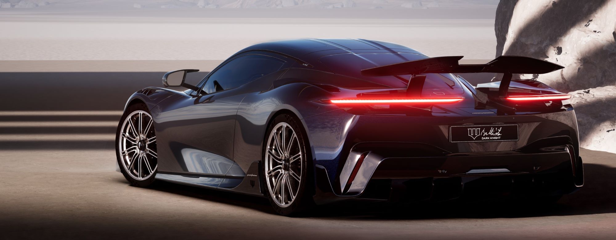 The Battista Dark Knight is draped in an exquisite Nero Profondo gloss paint, a deep light-absorbing black that reflects only the aerodynamic elegance and sophisticated nature of its design. The exterior features distinct Wayne Enterprise logos on the side skirts and roof, subtly integrated into the overall design.