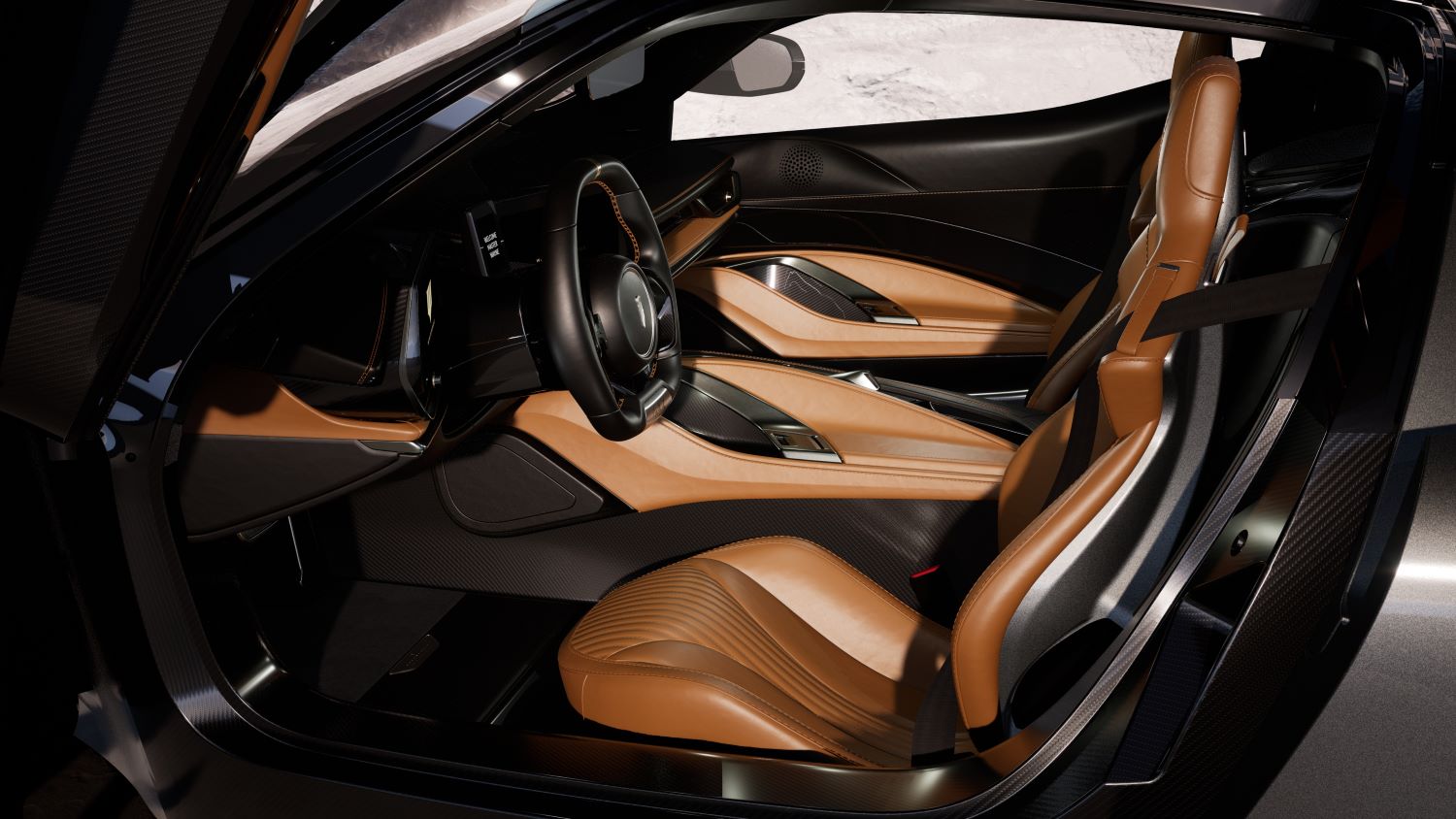 - GT seats upholstered in Tan Leather with bespoke quilting in the center panels and Tan stitching. Seats with front exposed signature satin carbon fiber and Argento Vittorio gloss paint on the back