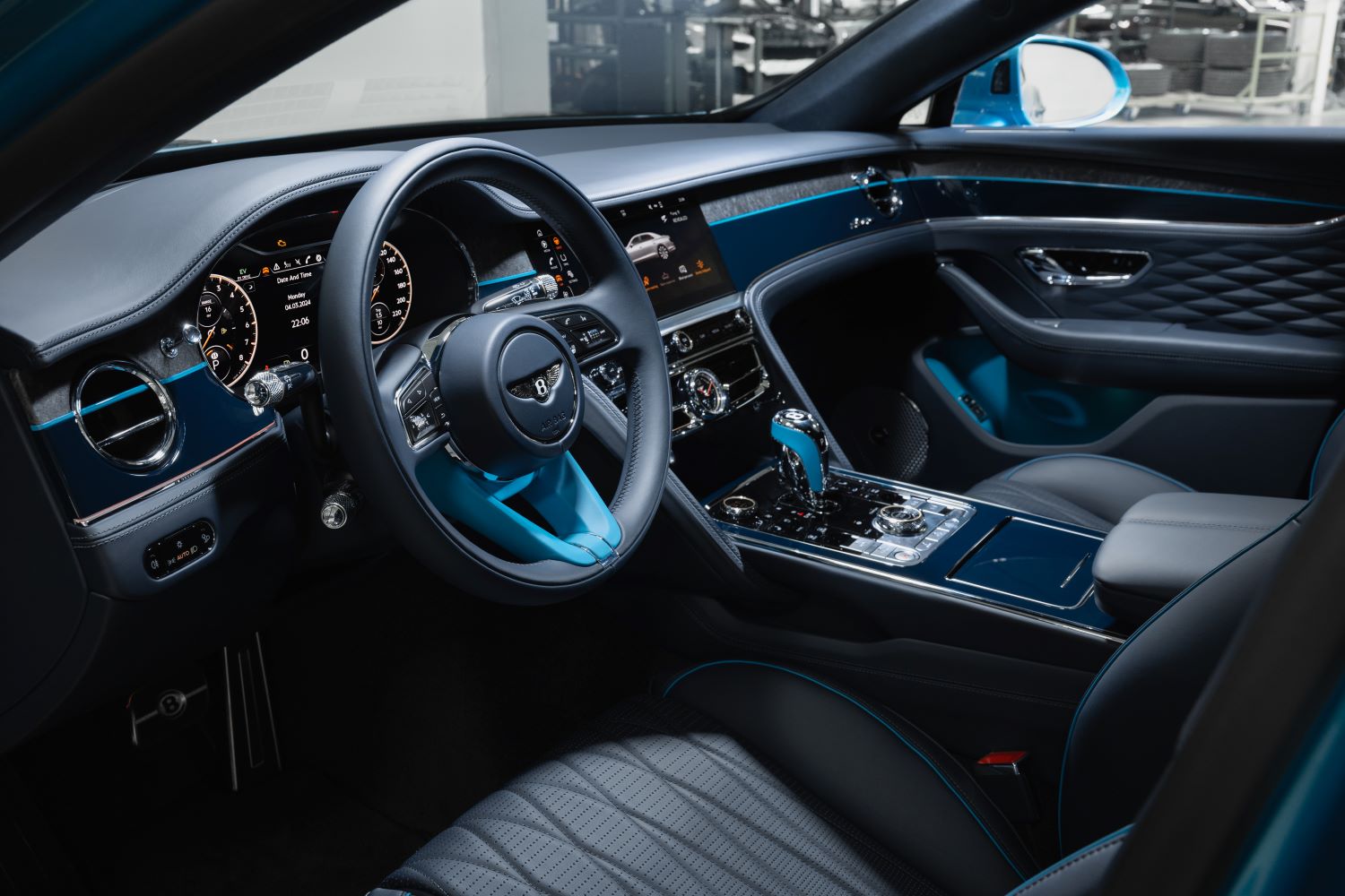 The Flying Spur Azure Hybrid also shares the luxury stand, presenting various bespoke personalisation details in the cabin, including Galaxy Stone over Imperial Blue Dual Finished Veneer. Bentley’s team of expert veneer hunters went to extraordinary lengths to select the stone veneer, showcasing a fusion of century-old craftsmanship and advanced technologies. This results in variations in colour, pattern, and texture which are almost impossible to imitate. Bentley’s revolutionary stone veneer interior finish makes for a magnificent contemporary feature of natural products formed over 200 million years ago.