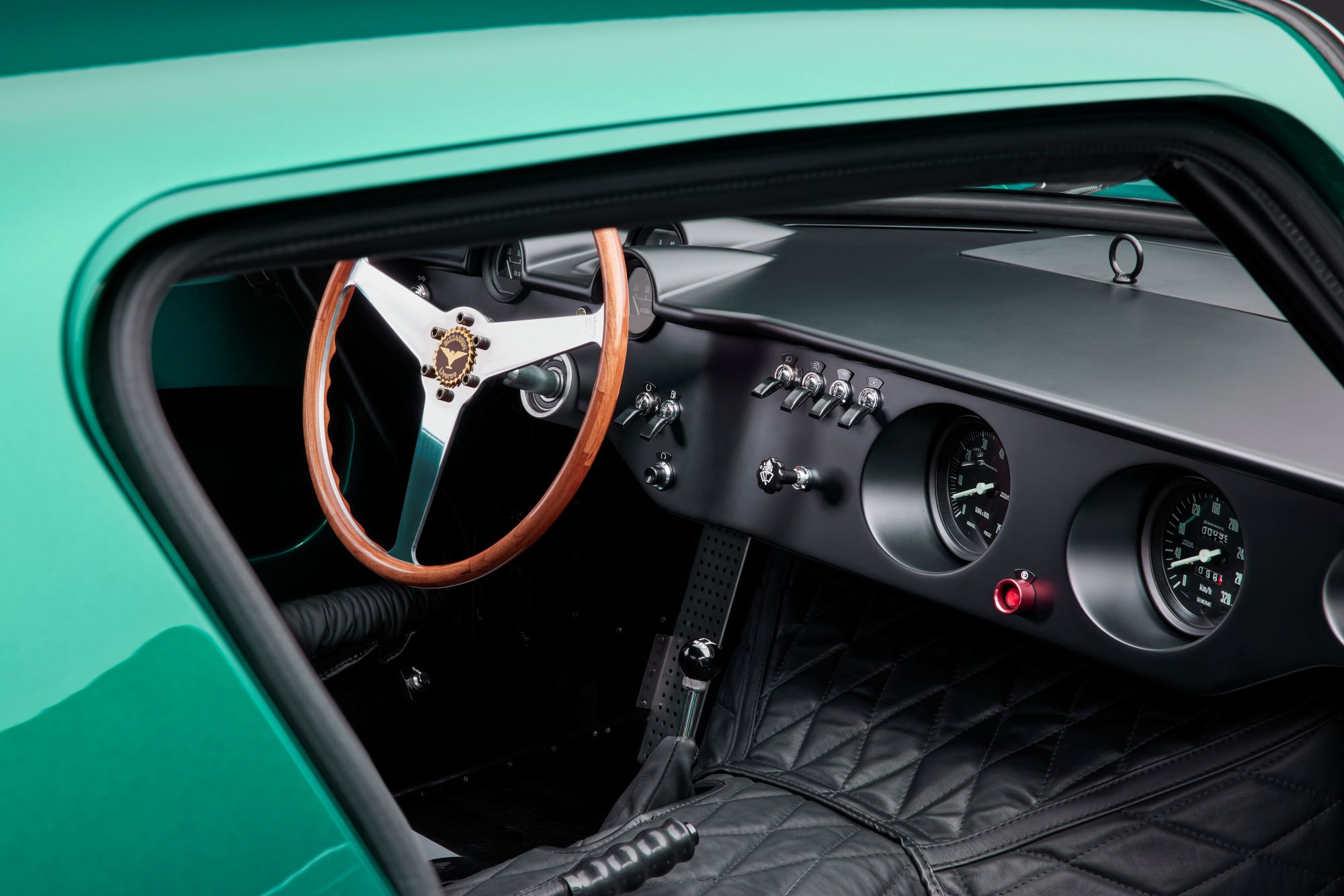 Each car in the Revival series of 24 vehicles is a hand built continuation, authentically based on the car that won its class at Le Mans in 1965, with a lightweight single piece composite body, over a steel frame. Inside, the two seats are protected by a more comprehensive six-point roll cage and safety fuel cell, meeting FIA Appendix K regulations. Test drives of the Revival revealed a car that feels subtly more rigid than original examples. With a front-mid engine layout, independent rear suspension to Giotto’s Corsa specification and all-round disc brakes paired with a period-specific 5,300 cubic centimeter V8 developing over 400 horsepower, the Bizzarrini 5300 GT Revival Corsa has a power to weight ratio comparable to a modern supercar.