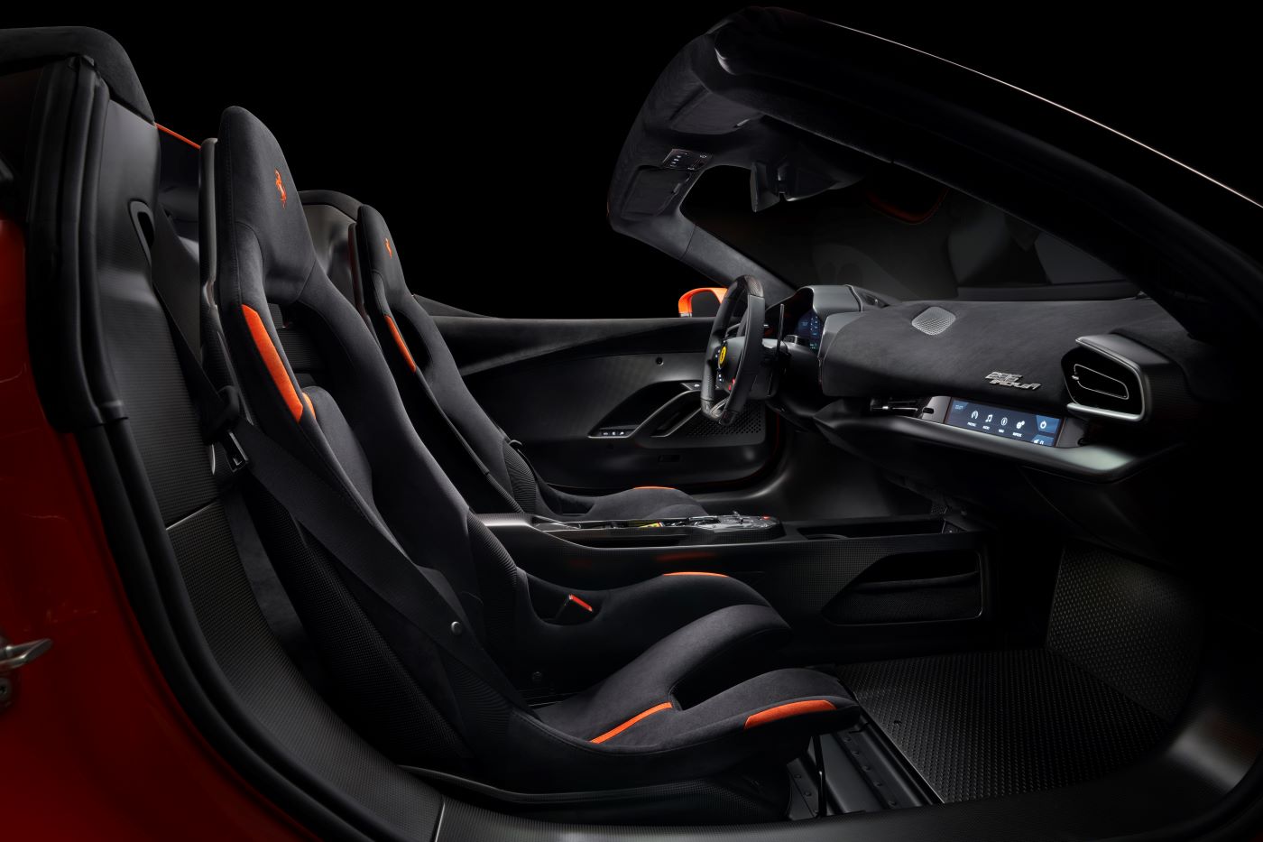 The interior design of the 296 Speciale A follows the same philosophy applied in all latest generation Ferrari special versions. The changes with respect to the 296 GTS include solutions to simplify the interior, with fewer elements in total, and save weight, with an even more extensive use of carbon fibre and Alcantara©. In addition to the widespread use of carbon fibre and aluminium, the more pared-down design language also contributes to the overall effect of a much more race-focused cabin.