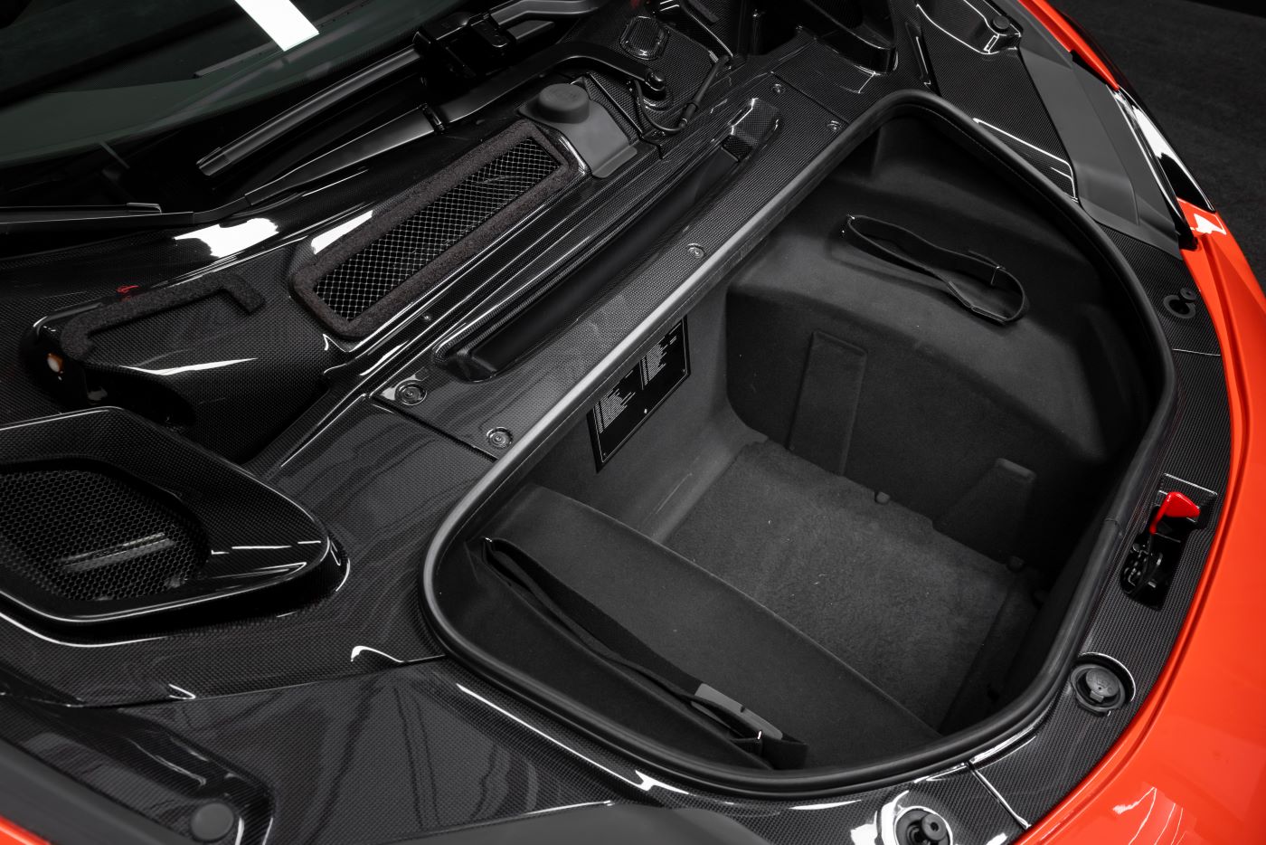 A specific door panel was created for the 296 Speciale A consisting of a single block of carbon fibre with a minimalist design. The grab handle consists of a raised section of a functional zone which terminates in a distinctive, clean-cut surface. Creating a sense of continuity with the material of the rest of the panel, the speakers of the Hi-Fi system are incorporated into this zone, with sound from the woofers passing through holes cut directly into the carbon fibre.