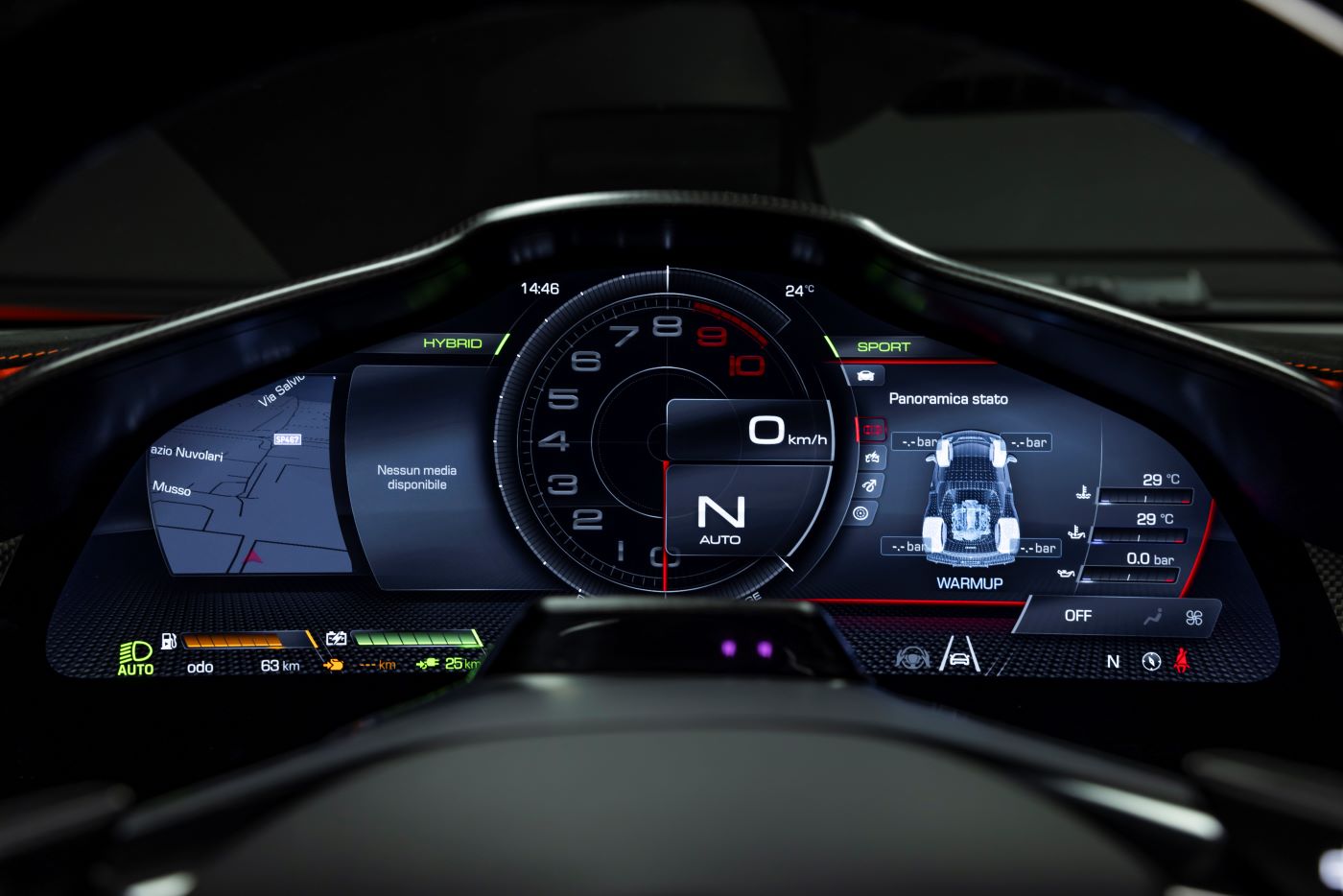 A specific curved indicator on the instrument cluster, placed on the right-hand side of the tachometer, lets the driver know when boost power is available and displays how many extra boost bursts are left. The control strategy optimises the function to ensure enough boost bursts to complete at least one whole lap of the circuit the car is on. This is made possible by a heuristic approach which considers the circuit as a whole and allows the strategy to determine where boost power will be most effective and exclude sections of the track where it would offer no benefit. At the Fiorano circuit, for instance, the extra boost function can be used 14 times over two laps, while at Mugello, the function allows for a total of 15 boost bursts over a single lap.