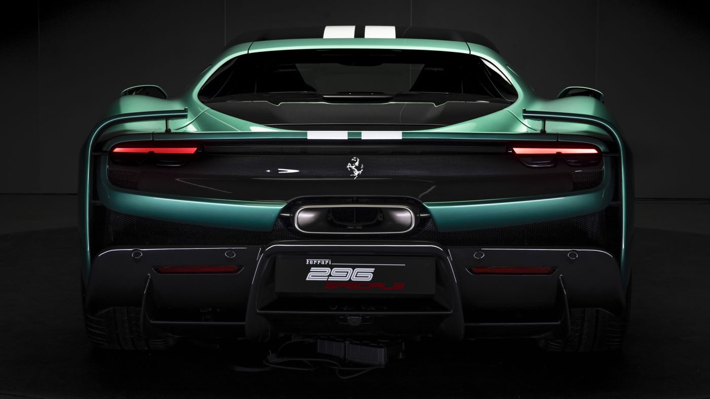 Among the most distinguishing features at the rear of the car are the side wings, which merge two concepts derived from motor sports – namely the vertical fins and small wings featured on the FXX K and the vertical external profile of the bumper of the 296 Challenge – into a single element. The curved geometry of these wings, which embrace the rear corners, serves two functions: the vertical fin optimises wake management to reduce drag, while the profile of the horizontal surface generates downforce. The positions of these side wings on the tail also allows them to interact with the cooling air flow from the rear radiators, improving the cooling efficiency of the radiators themselves. The side wings complement the functions of the active spoiler, which is derived from the 296 GTB but features a completely revised actuator management strategy that minimises the transition time to High Downforce and also introduces a new intermediate Medium Downforce configuration to improve rear-end stability at high speeds.