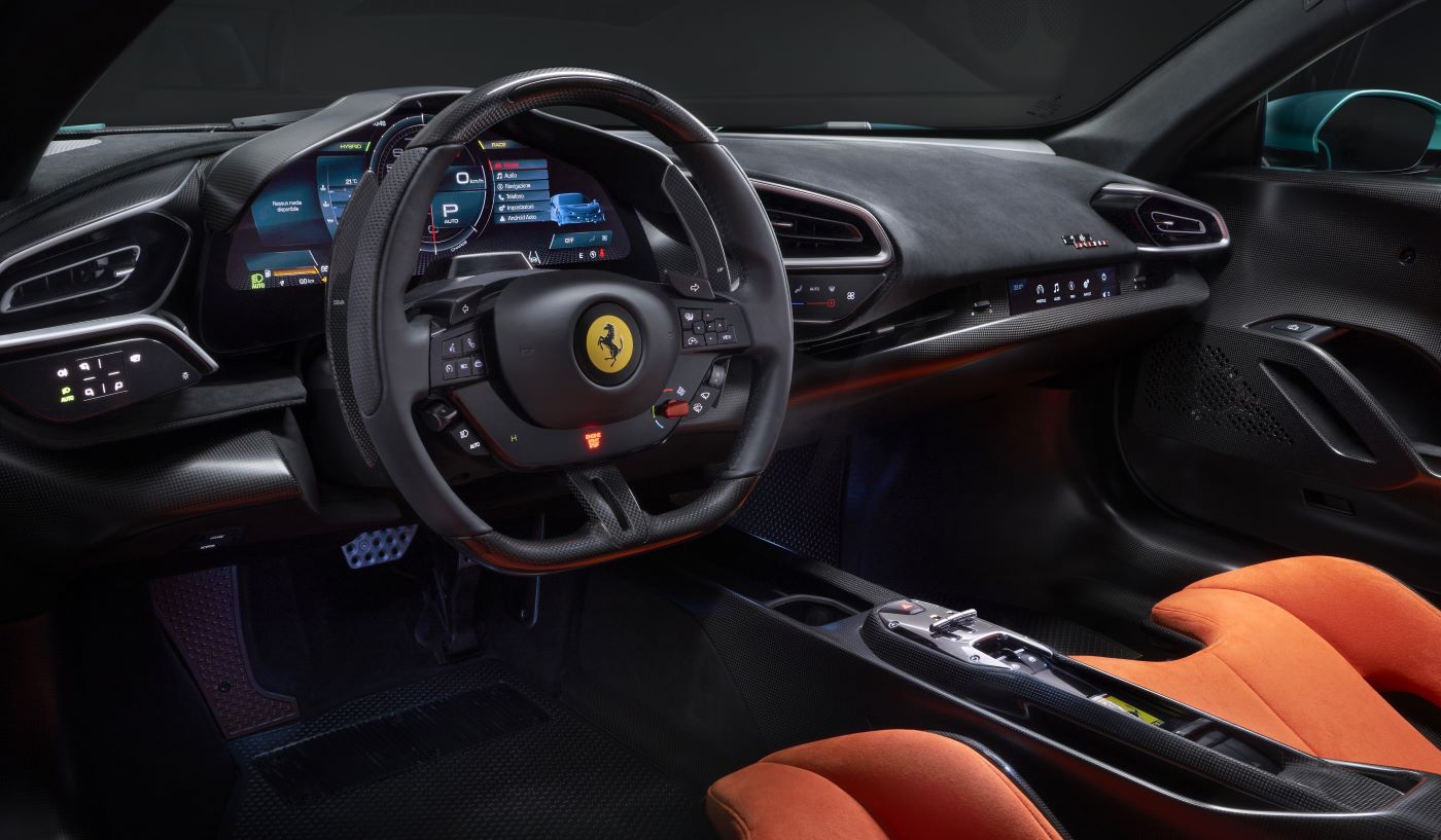 The interior design of the 296 Speciale follows the same philosophy applied in all latest generation Ferrari special versions. The changes with respect to the 296 GTB include solutions to simplify the interior, with fewer elements in total, and save weight, with an even more extensive use of carbon fibre and Alcantara©. In addition to the widespread use of carbon fibre and aluminium, the more pared-down design language also contributes to the overall effect of a much more race-focused cabin.