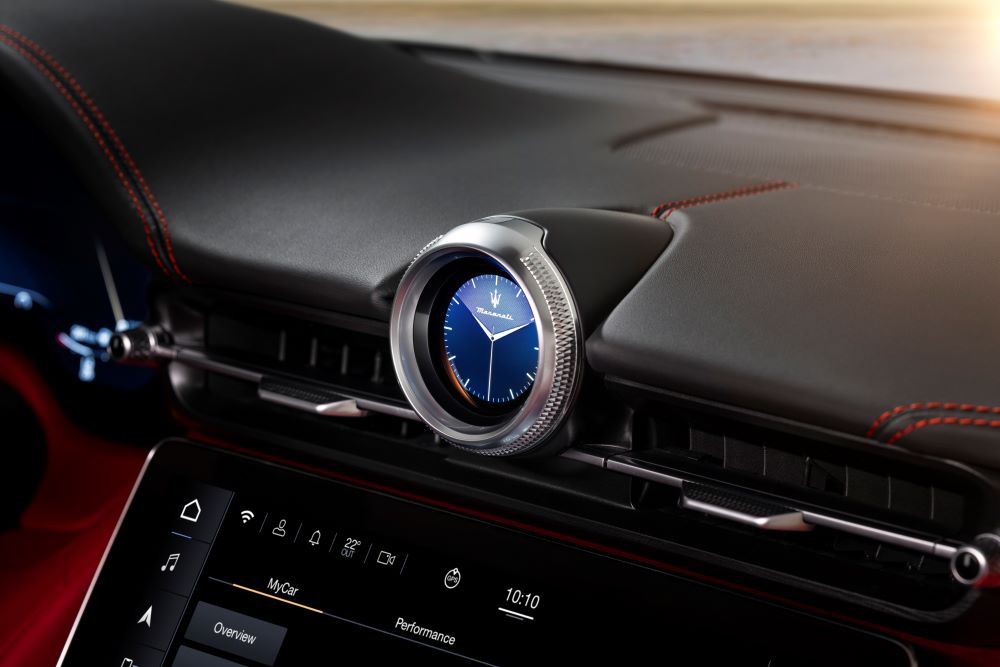 - Maserati Digital clock. The best-loved in-car clock ever. An icon of the past transported into the future, revisited with modernity and functionality in mind. Reconfigurable in terms of various features: three skins (Classic, Design and Sport), four dynamic animations (compass, G-force meter, accelerator, and stopwatch) and contextual pop-ups (smartphone connection via Bluetooth and start of wireless phone charging). Users can also interact with the Digital clock via the voice command “Hey Maserati”, to operate the voice assistant and quickly control the aircon, media, navigation, and phone calls.