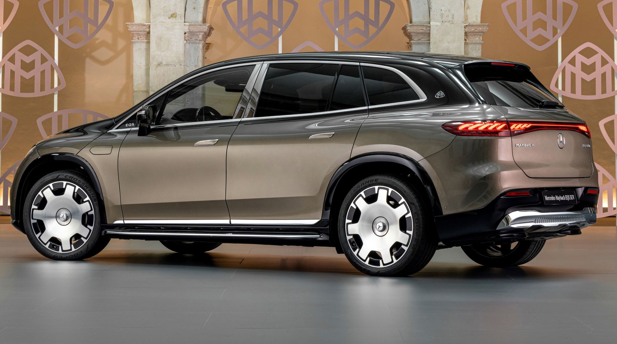 When viewed from the side, specific features include the bold chrome surrounds on the side windows and the chrome-plated B-pillar trim. This decorative element is an integral part of the MercedesMaybach signature and highlights the length of the rear seating area. While the Maybach emblem, underlining high quality, shines on the D-pillar, the subtle EQS lettering is integrated into the front window triangle. The pronounced wheel arches with claddings in high-gloss black emphasize the SUV’s power and emotional presence. The Mercedes-Maybach EQS SUV is equipped with exclusive 21-inch alloy and forged wheels, including MAYBACH lettering on the integrated, exquisitely designed wheel hub caps. In addition, 22-inch wheels will be available soon after the U.S. market introduction as well.  Another striking detail is the standard running boards, which are illuminated in the dark and feature a stylishly integrated Maybach emblem. The surface is made of anodized aluminum, which echoes the pinstripe look of the black panel front.