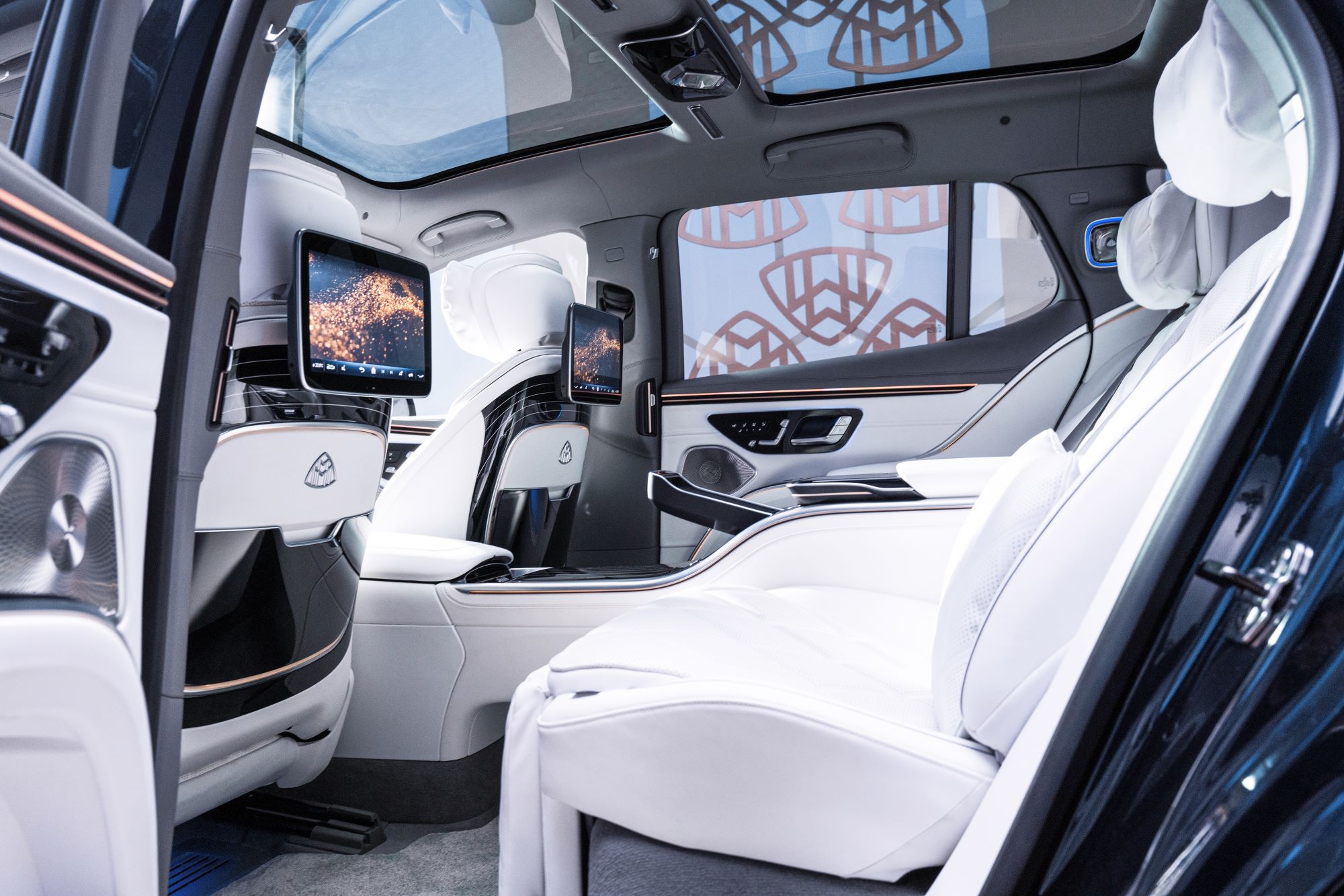 A contemporary illuminated lamp with the Mercedes-Maybach logo is integrated into each of the Cpillars as standard equipment. The adaptive rear lighting offers additional reading lights in the grab handles and light strips in the headlining. The brightness, as well as the size and position of the light spots, can be adjusted. At the same time, a wide range between precise work and relaxed lounge light is possible. The setting of the light color automatically adapts to different times of the day, but can also be adjusted by hand from a daylight white to a warm white. Ambient Lighting also runs through the entire vehicle right up to the roof liner and behind the rear seats. In addition, the Mercedes-Maybach EQS SUV contains Active Ambient Lighting with 253 individually controllable LEDs and 64 individually selectable colors. These include the Maybach-specific color schemes of Rose Gold White and Amethyst Glow. The diverse options for individual lighting moods also underline the cocooning effect. The brandexclusive “Welcome” presentation greets passengers with a special light play: a carpet of light runs across the vehicle and particularly sets the scene for the rear doors.