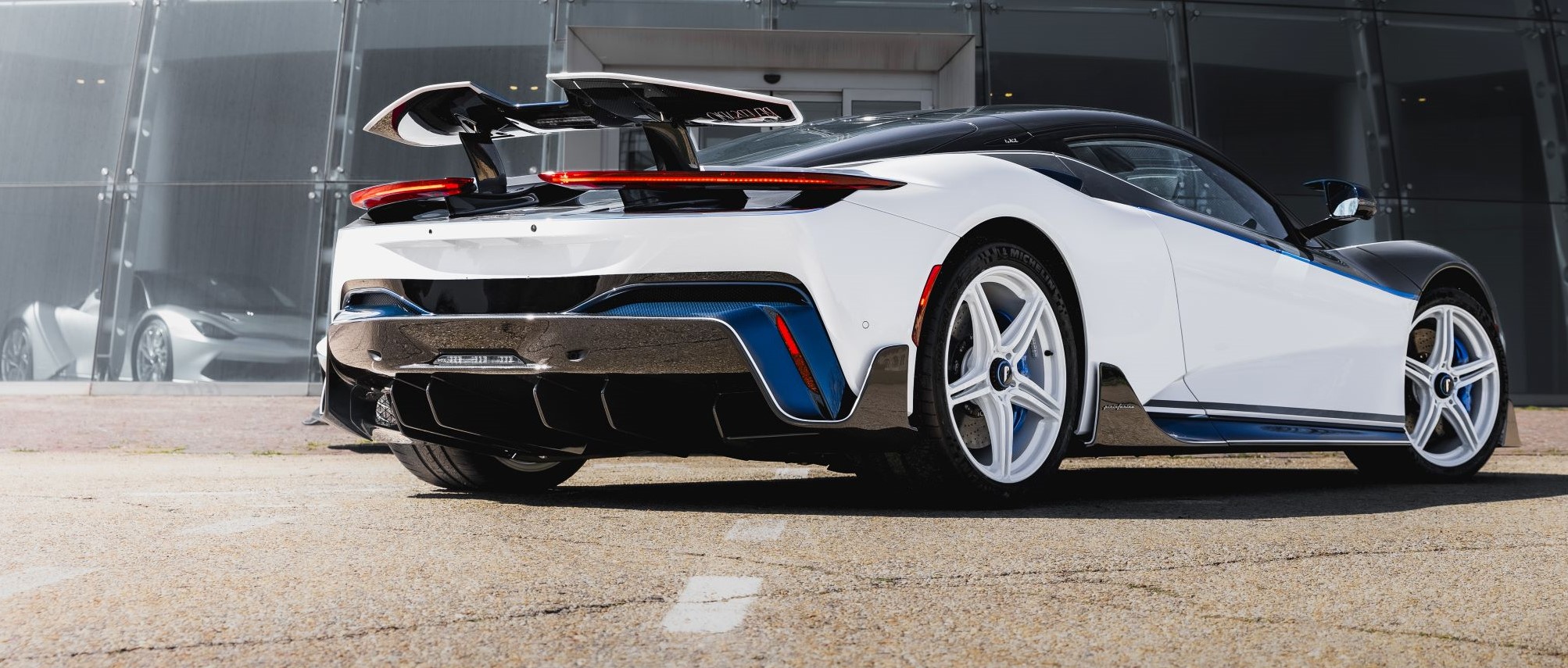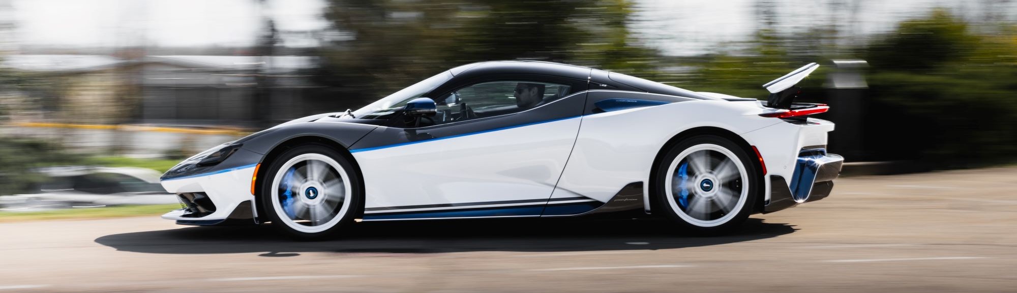 Battista Anniversario is also equipped with the ‘Furiosa’ package, comprising a revised carbon fibre front splitter, side blades and rear diffuser. Exclusively on the Anniversario, these parts are finished in a two-tone combination of Exposed Signature Carbon tinted in Iconica Blu with pin stripes in Bianco Sestriere. Besides the exclusive livery, a bespoke rear wing, rear aero fins and other bespoke details are unique to the Battista Anniversario. The aerodynamic enhancements deliver increased downforce and greater stability at higher cornering speeds and a more dynamic balance to the car.