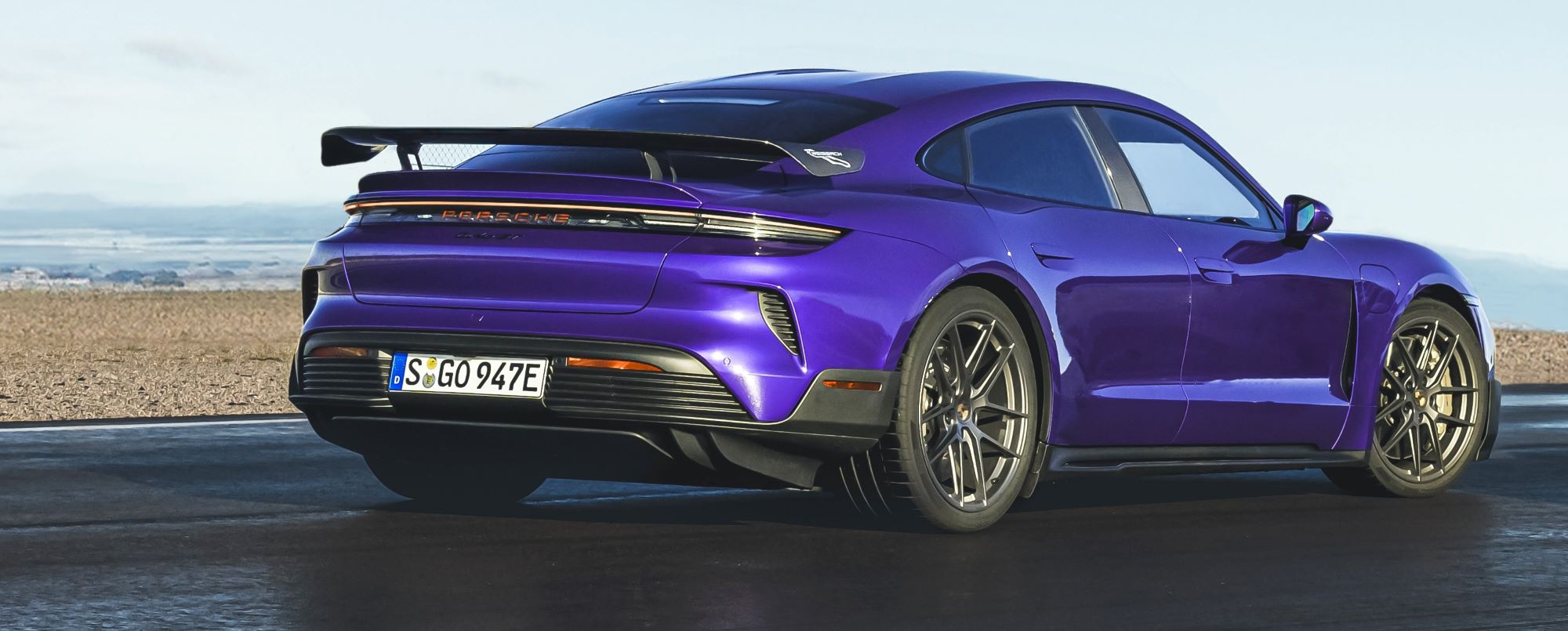 Porsche developed a front spoiler with aeroblades specifically for the Taycan Turbo GT. The rear view is dominated by an adaptive spoiler, the edge of which features a Gurney flap in a high-gloss carbon fiber weave finish.