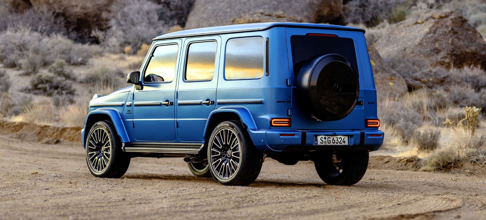 Inside and out, unmistakable design elements give the all-new Mercedes-AMG G 63 its unique appearance. MANUFAKTUR Hyper Blue Magno exterior paint is available exclusively for the top G-Class model. The front end is characterized by a new AMG-specific bumper with three vertical louvers in front of the air inlets, as well as stainless-steel inserts. Standard adaptive MULTIBEAM LED headlights illuminate the road according to the driving situation with 84 individually controllable high-performance LEDs. The taillights also feature LED technology.