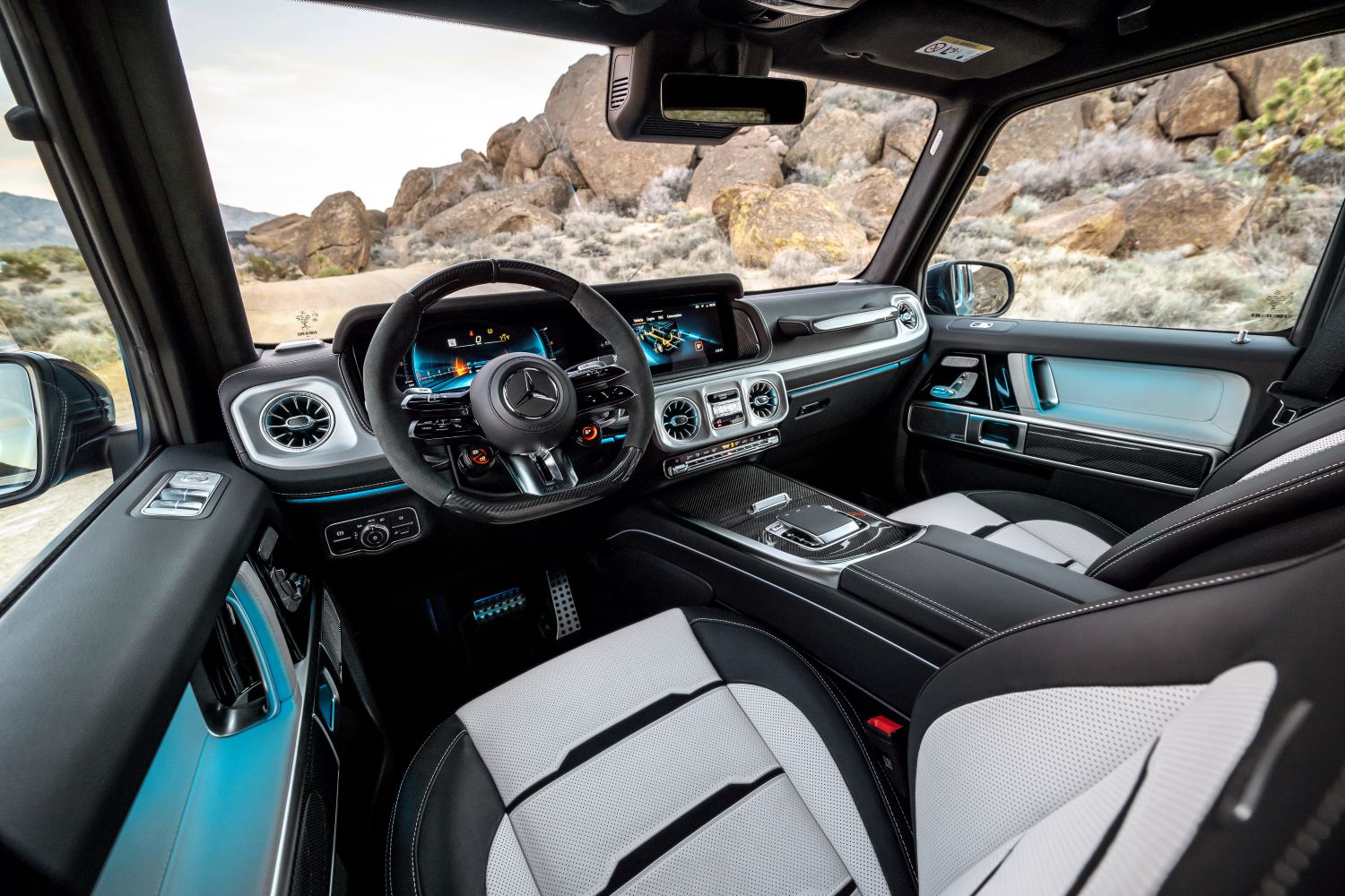 Unique details throughout the interior underscore the dynamic character of the AMG G 63. An AMG Performance steering wheel with twin-spoke design in Nappa leather with seamlessly integrated capacitive controls is fitted standard. The round AMG DRIVE UNIT steering wheel buttons with brilliant displays and intuitive operation can be used to control AMG-specific driving functions and all drive programs. AMG logos are highlighted on the steering wheel spokes, central display, door sill panels, floor mats and front seat backrests.