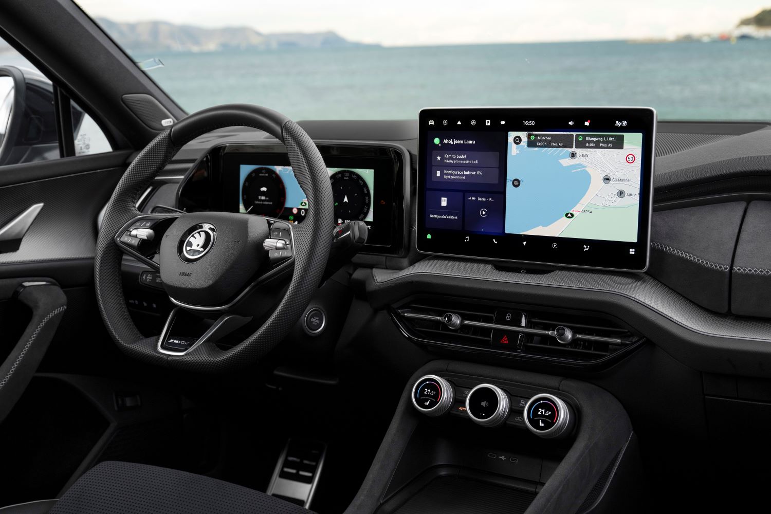 - More space and comfort: roomier, minimalistic interior design featuring sustainable materials, Škoda Smart Dials, head-up display and infotainment with ChatGPT