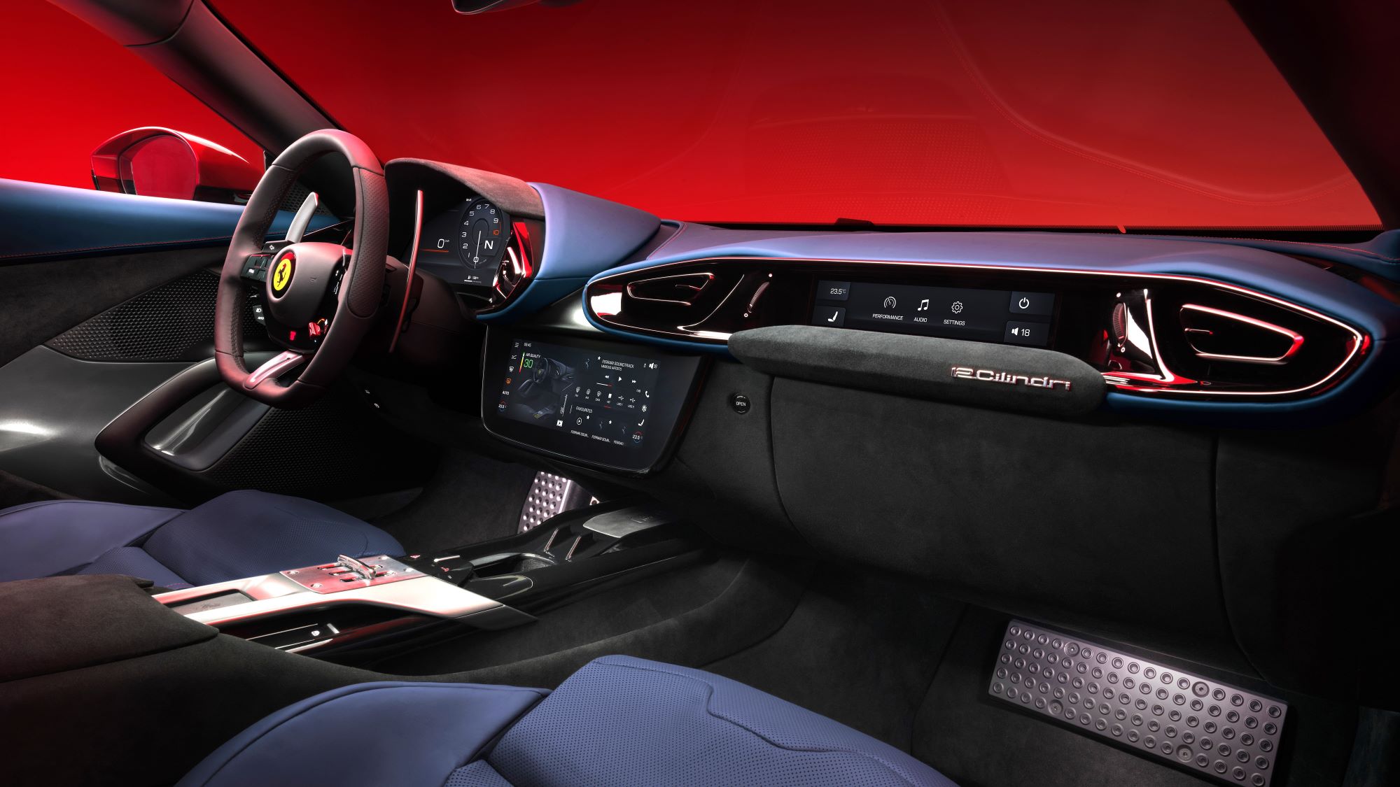 The Ferrari 12Cilindri’s cockpit guarantees superb comfort for both driver and passenger, even on long journeys: its feeling of airiness and space is heightened still further by a glass roof, prestigious materials and a central display in addition to one for the driver and a third ahead of the passenger.