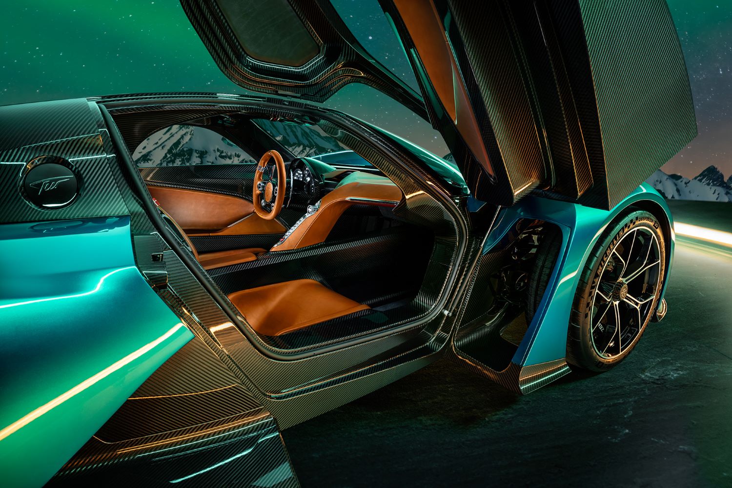 The elegant lines of the Tur manage the flow of air over, under and through the monocoque extremely efficiently, creating a more efficient flow through the air with a lower drag co-efficient than its more track-focused sibling. Underbody aerodynamics are complemented by active rear wing ducts, providing enhanced stability levels. Beyond this, the design combines with a standard four-wheel-drive system, adding to the grip levels, and much easier access to harness and exploit the power available. While the addition to the drivetrain increases the overall weight by 150kg (330 lb) to around 1,450kg (3,197 lb), the more aerodynamically efficient shape will accelerate on to a top speed of 280mph (450km/h). The cabin is appointed with high specification, tactile materials and increased levels of sound proofing, producing a more traditional luxury GT environment for the occupants, hence the name ‘Tur’ – Danish for ‘Touring’.